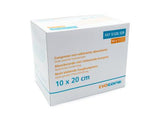• Het steriele verband bestaat uit een toplaag en een wondcontactlaag van 100% polypropyleen, rondom gesloten. Het heeft een 100% pulpgevulde kern aan de wondcontactzijde en een blauwe waterafstotende laag van 100% polypropyleen. De waterafstotende laag voorkomt dat wondvocht naar de bovenkant van het verband loopt. Het verband moet ten minste eenmaal per dag worden verwisseld, of eerder als het verzadigd is. Het verband moet worden vastgemaakt.